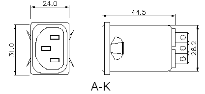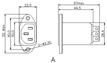 | AC-DF001 | 125/250V | A | fig.1 | ≤0.5mA | 52 | 22.5 | 57 | 40 | 2-Φ3.3 | 插片 |